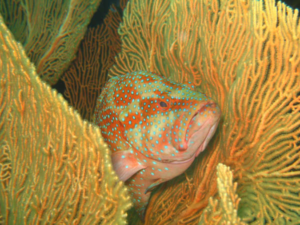 Onwards to Koh Tachai, another little island north of Koh Bon. On our way, a pair of dolphins cruised by and Thai fishing boats cast out their nets in the deep waters between the islands. We pulled up to the island's south end just as it was getting dark, and moored up to the pinnacle submerged just offshore. Ken was going to sit the night dive out in favour of a nap, so I joined up with a bunch of other people going in. We descended the mooring line onto the flat top of the pinnacle, and were surrounded by plumes of multicoloured feather stars and soft corals that made it look like an underwater flower garden. Scorpionfish were all over the place, easily spotted in the dark since they tend to land on corals that don't match their regularly very good camoflauge. Lobsters, moray eels, and clearfin lionfish were out in droves. At one point, we noticed a huge barracuda hovering around in the dark, looking a bit suspicious... suspecting that he was hunting, we all had the same idea at the same time, and moved our lights over to a few innocent fish that were minding their own business nearby. Sure enough, the barracuda took advante of an easy illuminated target and slowly glided toward the fish, then in a split second lunged forward and swallowed it whole. He chomped it down in a couple big gulps and then disappeared into the dark. I felt a bit guilty for having a hand in that fish's death, but it was pretty cool to see the food chain in action! We carried on, and later we were hovering over an odd scene where an eel and a large parrotfish were hanging out side by side under a table coral... when all of a sudden, out of nowhere, the same barracuda came flying out of the darkness behind us, blasted into our light beams, mouth open, coming within a couple feet of one guy's arm! Just as fast as he came, he disappeared, having scared the hell out of us and the poor parrotfish, who burst out of his night time mucus sleeping cocoon and went to hide under a rock. We all looked at eachother, realizeing that he amost made dessert out of us! He was clearly circling the pinnacle hunting, so we were extra careful after that to not shine our lights on eachother! It made for an exciting night dive - one of those dives where everyone can't stop talking about it when your head breaks the surface.